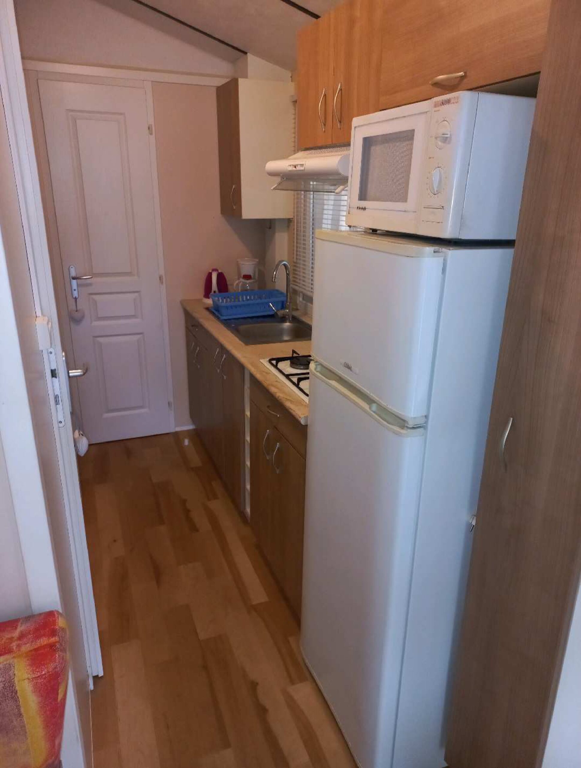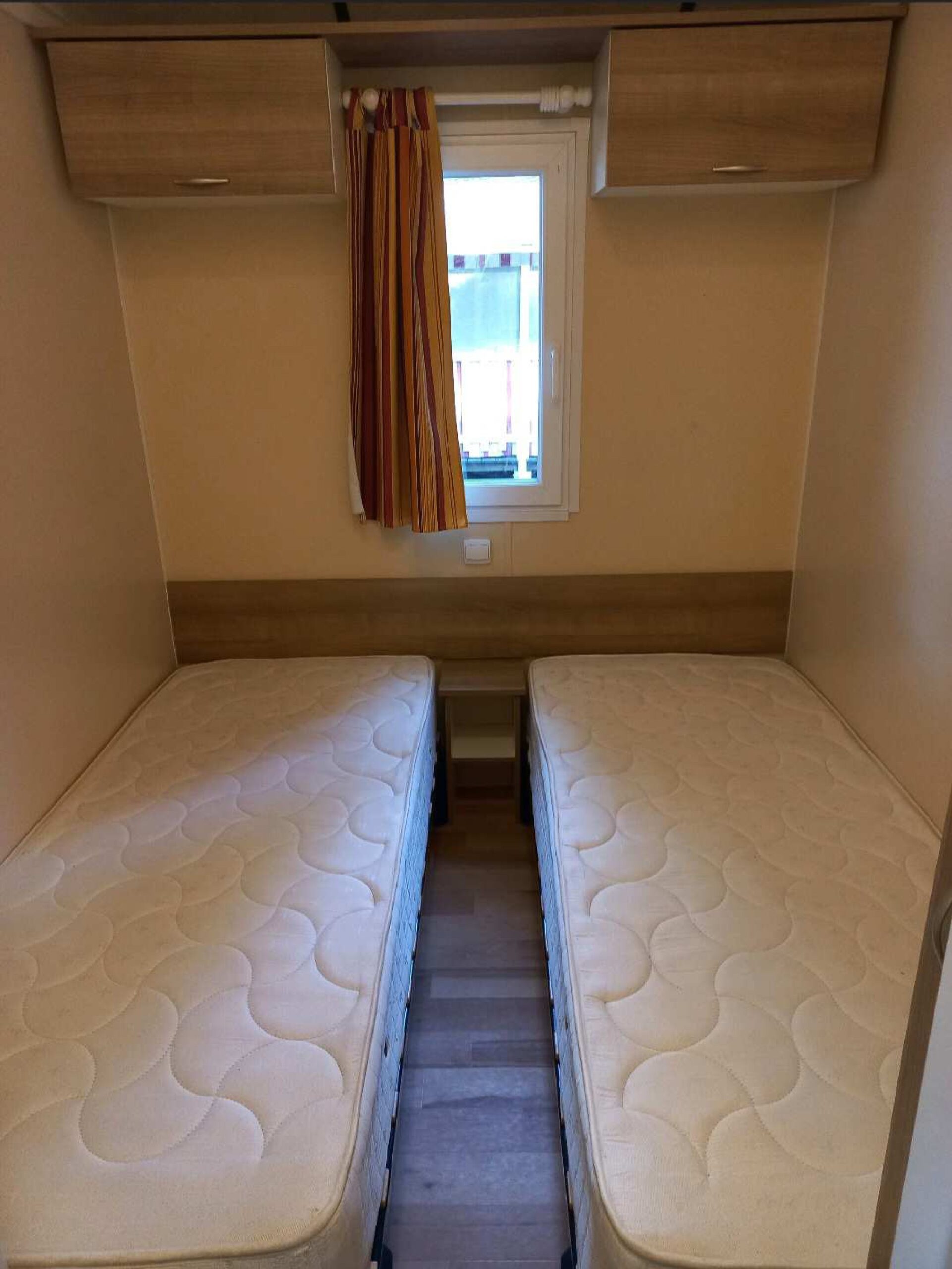 Terrasse couverte, salon jardin bois, chaises longues teck, plancha gaz, étendoir à linge, vélo pliant à disposition. Emplacement voiture à côté du Mobile home.